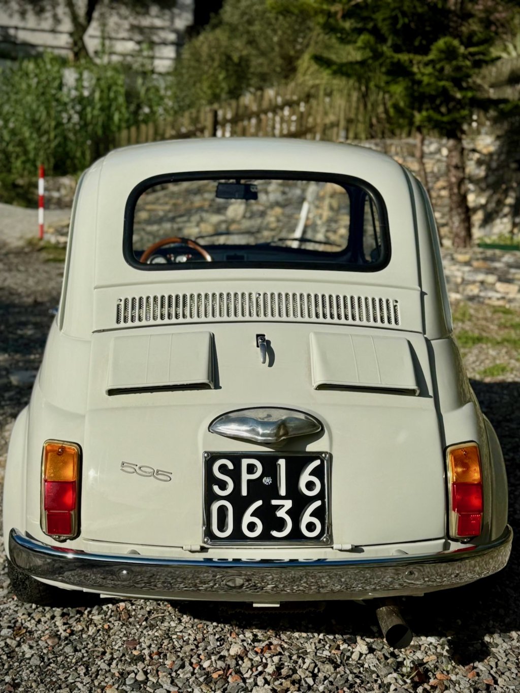 サイドにはお馴染みのアバルト595ステッカー、そしてリアのエンジンフードにはただ595とだけシンプルに…。